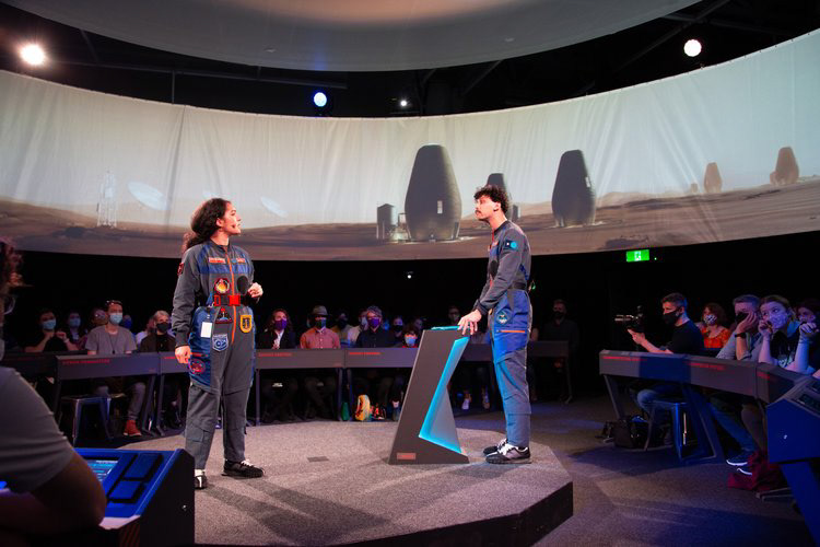 Destination Mars is a mixed-reality experience designed for both adults and children. It is a 360-degree dome projection collaborative digital game and live performance come together to create an experience unlike anything else on Earth (or Mars).
